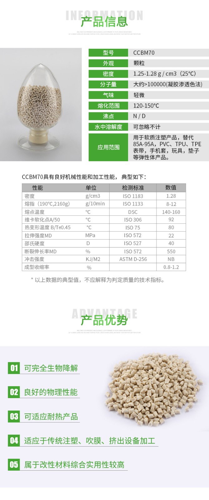 100000(凝膠滲透色法) 氣味;輕微 熔化范圍:20-150°℃ 沸點(diǎn):N/D 水中溶解度:忽略不計 應(yīng)用范圍:用于軟質(zhì)注塑產(chǎn)品,替代85A-95A,PVC、TPU、TPE表帶,手機(jī)套,玩具,墊子等彈性體產(chǎn)品。" />